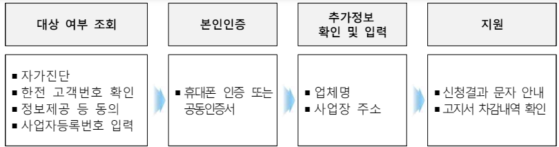 - 대상 : 신청자(혹은 신청자의 사업체(개인사업자/법인사업자)) 명의 전기사용을 계약하여, 신청자(혹은 신청자 사업체) 명의와 한국전력(이하 구역전기사업자 포함) 계약자 명의가 일치하는 경우