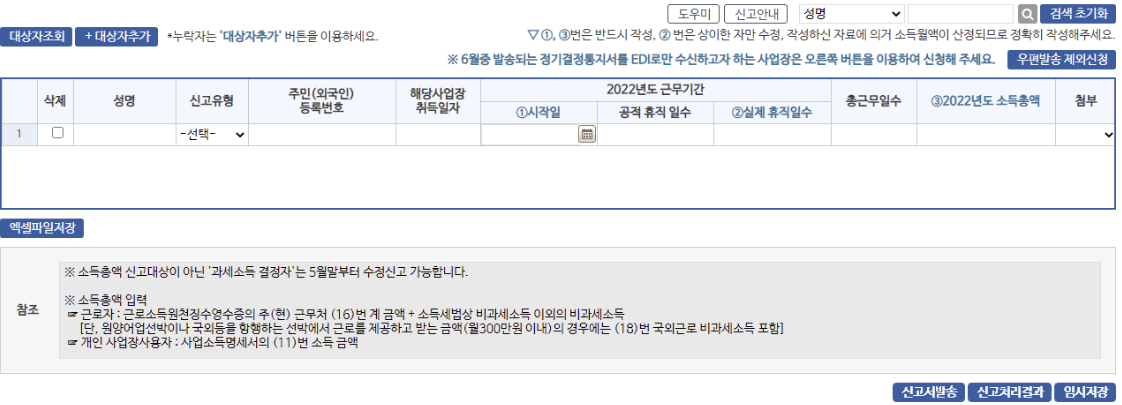 ※ 소득총액 신고 안내문을 받고, 신고를 위해 대상자를 조회할 경우 신고 대상자가 자동적으로 등록 되어 있습니다.
