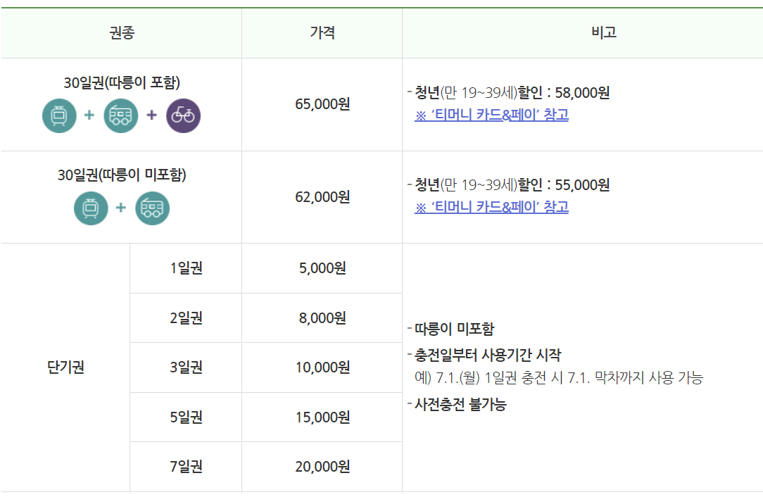 30일 단일권종을 30일 또는 단기권 선택 할 수 있고, 청년권은 7천원 추가 할인 그리고 문화 시설 최대 50%할인이 된다는 사실 알고 계신가요?