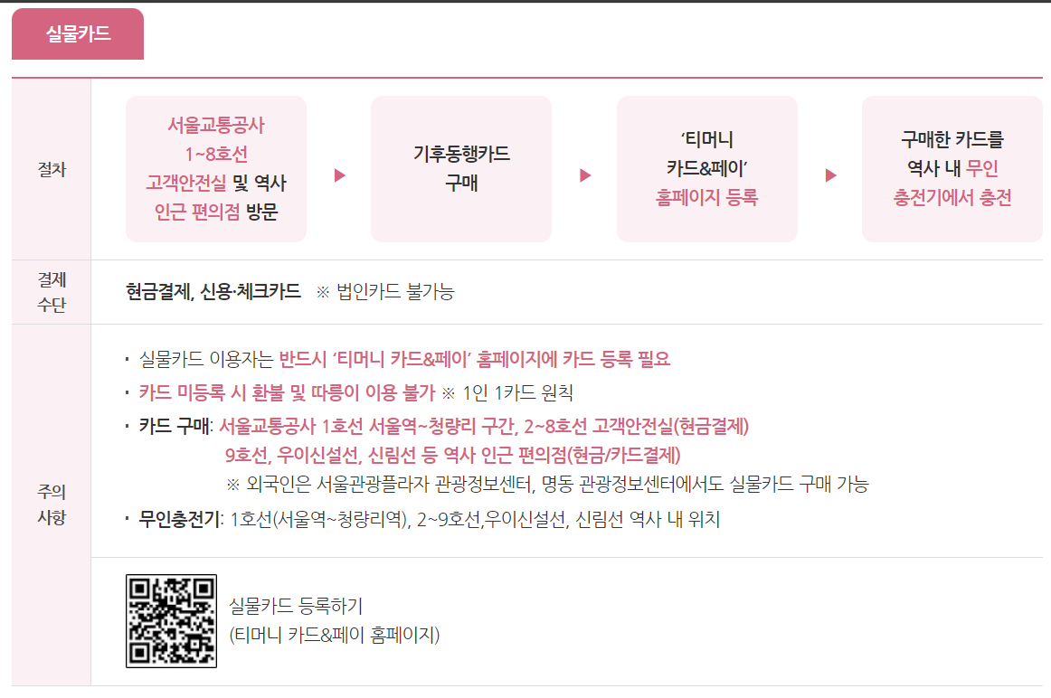 | 서울시 지하철 역사 인근 편의점(GS25, CU, 세븐일레븐, 이마트24) *판매처 목록은 ‘티머니 카드&페이’ 공지사항 내 별도 게시 | 3,000원 ( 카드·현금 구매 가능) |