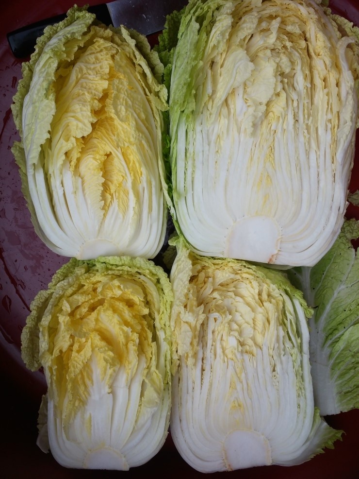 1. 배추는 겉잎을 떼어내고 반을 가릅니다. 크기가 크면 반을 가르고 밑동으로 칼집을 조금 내주세요